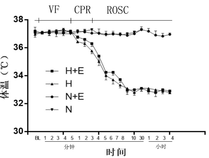 N组及N+E组大鼠保持大鼠体温在(37.0±0.5)℃。H+E组及H组大鼠在CPR时开始降温,8 min内降至目标温度(33.0±0.5)℃并维持至ROSC后4 h,见图 1。