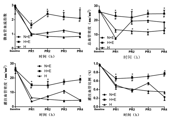 三组大鼠的舌下微循环各指标:微血管血流指数(MFI)、总血管密度(TVD)、灌注血管密度(PVD)和灌注血管比例(PPV)基础状态下差异无统计学意义(P > 0.05)。复苏后三组大鼠的上述微循环各指标显著下降(P < 0.05)。H+E组大鼠各时间点MFI、TVD、PVD和PPV显著高于N+E组以及H组(P < 0.05),N+E组大鼠在复苏后2~4 h的TVD明显高于H组(P < 0.05,图 4)。
