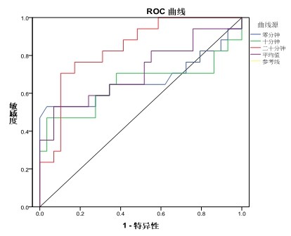 图 1 不同时点PETCO2值预测自主循环恢复的ROC曲线
