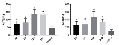 | 各时间点组与对照组相比较,aP<0.05 图 1 CLP术后不同时间点小鼠ALT和AST的变化 Fig 1 The variation of ALT and AST after CLP between different mice groups |