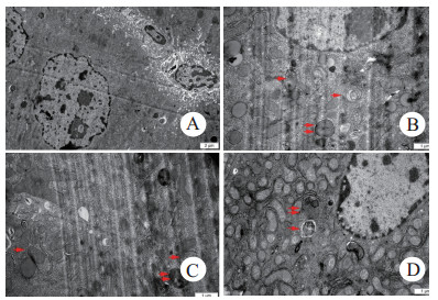 | A为对照组(×8 000),B、C、D均为CLP 6 h组(×12 000) 图 4 小鼠肝组织自噬体和自噬溶酶体 Fig 4 The autophagosome and autolysosome in mouse liver tissue |