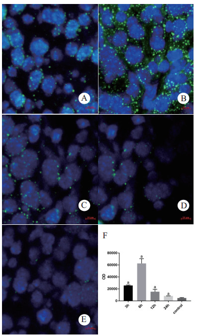 | A:3 h组B:6 h组C:12 h组D:24 h组E:control组F:各组蛋白荧光强度各时间点组与对照组相比较,aP<0.05 图 6 小鼠肝组织LC3Ⅱ蛋白荧光强度变化(×400) Fig 6 Fluorescence intensity changes of LC3Ⅱ protein in mouse liver tissue(×400) |