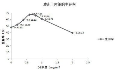 在一定浓度范围内DG对PQ诱导的肺泡上皮细胞具有增殖促进作用(图3)。在1 000 μmol/LPQ诱导的细胞中,DG剂量为0.2、0.4、0.6、0.8、1、2 mg/mL时其抑制率分别为(48.01±1.37)%、(40.68±2.33)%、(32.76±4.11)%、(34.12±4.3)%、(39.22±2.23)%、(51.26±0.39)%。