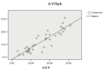 | r=0.888, p < 0.01 图 1 ΔVTIplr与ΔSV的相关分析 Fig 1 correlation between the patients' ΔVTIplr and ΔSV |