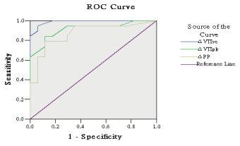 | 图 2 ΔVTIve、ΔVTIplr及ΔPP在所有患者中对于预测容量反应的ROC曲线 Fig 2 ROC curves for predicting capacity response in all patients: Δ VTIve, ΔVTIplr and ΔPP |