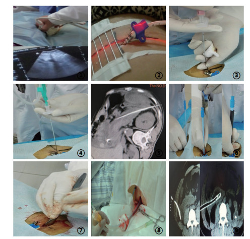 应用ALOKAα10彩色多普勒超声诊断仪或CT机,专用3.5 MHz凸阵探头及专用穿刺架。一次性使用中心静脉导管(三腔,CVC-2-7F-20)、单腔引流管采用10~12 F带穿刺针芯的凌捷一次性无菌留置引流管,多腔引流管采用8-10F康丽一次性无菌引流管,输液恒温器(冀州康复医疗设备厂,助邦牌E01型)。