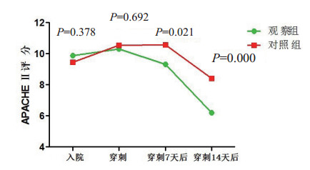 两组患者入院时和穿刺灌洗引流时APACHE Ⅱ评分均无统计学意义[(9.88±2.40) vs (9.46±2.35), P=0.378和(10.30±3.07) vs (10.54±2.96), P=0.692]。穿刺灌洗引流后7 d和14 d时观察组APACHE Ⅱ评分显著低于对照组[(9.32±2.49) vs (10.56±2.80), P=0.021和(6.20±2.54) vs (8.42±2.48), P<0.01]。见图 2