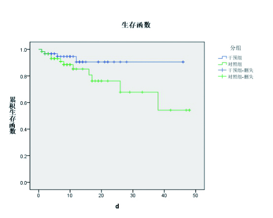 | 图 1 两组患者的50 d累积生存曲线 Fig 1 The 50-day cumulative survival curve of the two groups |