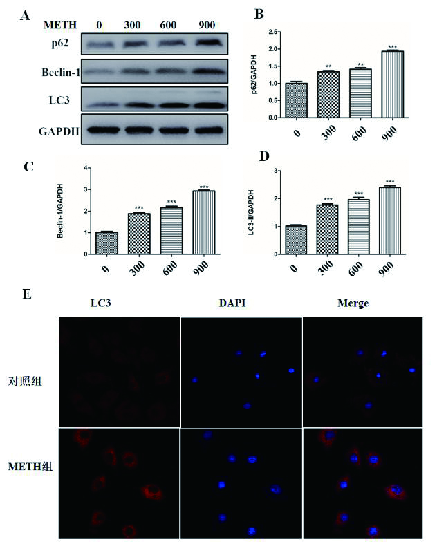 基于动物实验结果,进一步观察METH暴露对H9C2心脏细胞系自噬可能存在的影响。用Western blot和免疫荧光法对自噬相关蛋白表达量变化进行检测发现,H9C2细胞与300 mmol/mL、600 mmol/mL和900 mmol/mL的METH干预24 h后,细胞中自噬相关蛋白p62,Beclin-1和LC3的表达同样明显增高(图 2A-D),且各蛋白表达量与METH剂量有相关性(图 2B-D),差异具有统计学意义(n=3,P < 0.05)。图 2E示,900mmol/mL剂量METH干预H9C2细胞系后,与对照组相比,红色荧光显著增强,LC3蛋白表达明显增多。