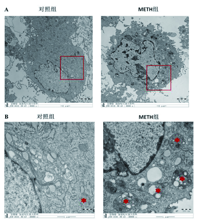 | A:8 000倍镜下细胞形态。B:将A图中红色矩形标记区域放大至30 000倍镜的细胞形态,典型自噬体采用星形标记。 图 3 透射电子显微镜观察冰毒干预后,H9C2细胞中自噬体数目的变化 Fig 3 The number of autophagosome in H9C2 cells was observed by transmission electron microscopy (TEM) |