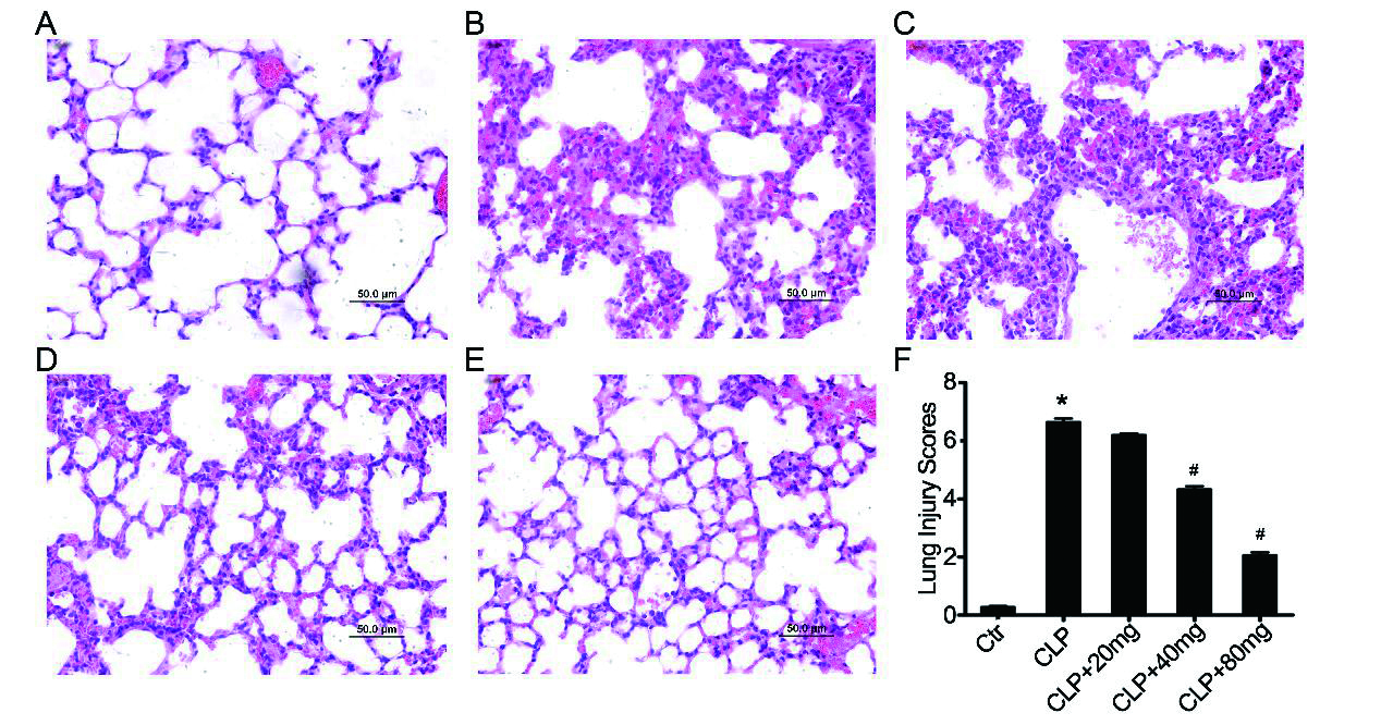 肺组织HE染色:对照组(A),脓毒症诱导的ALI组(B),木犀草素预处理脓毒症组(C-E)。(F)肺损伤评分。放大倍数200,n = 10 /组。与对照组相比,aP < 0.05;与脓毒症诱导的ALI组相比,bP < 0.05 图 1 木犀草素减弱体内脓毒症诱导的ALI Fig 1 Luteolin attenuates sepsis induced ALI in vivo