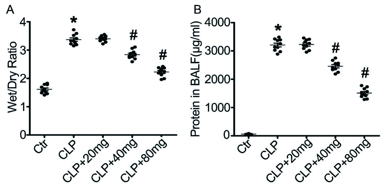 为进一步评价木犀草素对脓毒症引起的ALI的保护作用,检测了肺水肿(图 2A)和BALF中蛋白浓度(图 2B)。与对照组小鼠相比,脓毒症诱导的ALI小鼠中BALF蛋白浓度(图 2B)和肺湿-干比(图 2A)显著增加。然而,与脓毒症小鼠相比,木犀草素预处理以剂量依赖性方式显著降低脓毒症诱导肺水肿和BALF中蛋白浓度(图 2A2B)。