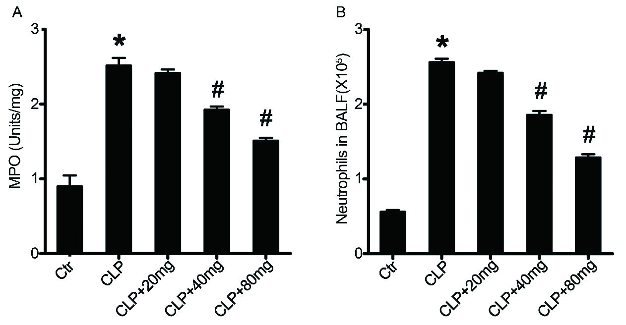 ALI与肺MPO活性有关,中性粒细胞外渗是受损肺组织炎症和免疫反应的主要标志[30-31]。此外,肺MPO活性也是肺中性粒细胞浸润的可靠标志[32]。因此,在脓毒症诱导后24 h测定了不同组中肺组织MPO活性和小鼠BALF中浸润的中性粒细胞的数量。