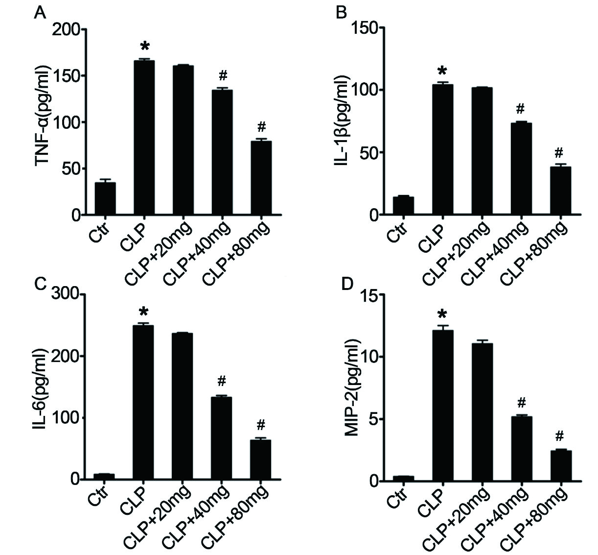 LPS是脓毒症中炎症和趋化细胞因子产生的主要刺激物,包括TNF-α、IL-1β、IL-6和MIP-2 [33-35]。为了分析木犀草素对脓毒症诱导的炎性细胞因子的影响,本研究使用ELISA测定了不同处理组BALF中TNF-α,IL-1β,IL-6和MIP-2的浓度。脓毒症诱导显著增加了BALF中TNF-α(图 4A),IL-1β(图 4B),IL-6(图 4C)和MIP-2(图 4D)的浓度,表明木犀草素可以抑制ALI小鼠中脓毒症诱导的炎症反应。