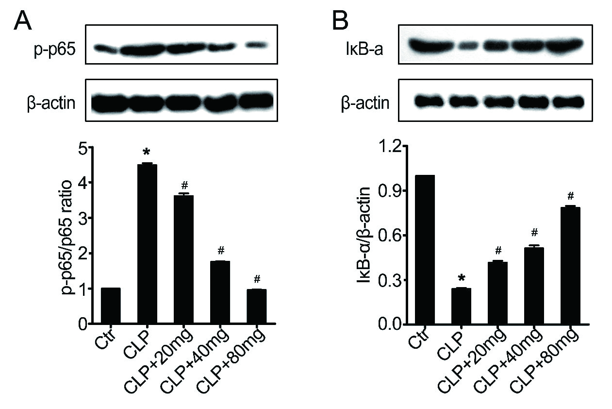 天然免疫的激活可以有效对抗感染,但不受控制的炎症可导致组织损伤[44]。NF-κB通路调节多种促炎介质(如TNF-α,iNOS和COX-2 [45])的转录,参与引发肺部炎症。脓毒症诱导可以增加NF-κBp65的水平(图 7)。木犀草素处理则抑制脓毒症小鼠肺组织中NF-κBp65的表达(图 7A)。另外,木犀草素是否可以抑制IκB-α磷酸化来抑制脓毒症诱导的NF-κB活化(图 7B)。与脓毒症小鼠相比,木犀草素预处理显著抑制IκB-α磷酸化。这些结果表明,木犀草素的抗炎活性可能与抑制体内NF-κB通路的激活有关。