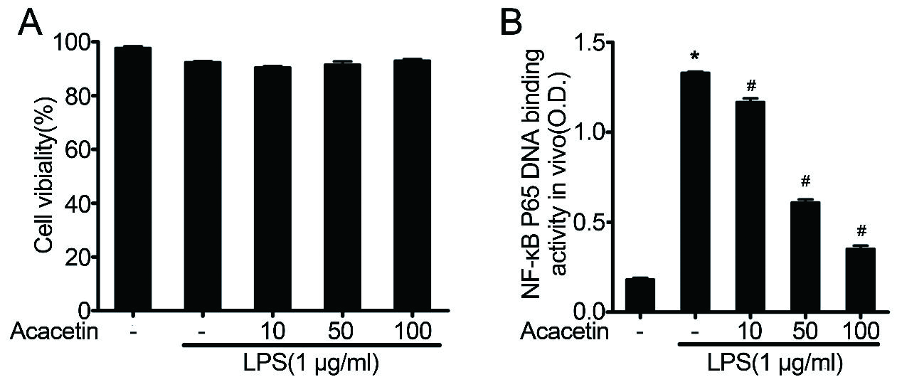 NF-κB信号通路对脓毒症诱导的炎症反应至关重要[46]。为了进一步研究木犀草素对体外NF-κB活化的影响,使用RAW264.7细胞研究了木犀草素对体外NF-κB p65 DNA结合活性的影响。MTT检测表明,木犀草素在100 μg的浓度下对细胞增殖没有影响(图 8A)。木犀草素预处理显著抑制LPS诱导的NF-κB p65的DNA结合活性。这些数据表明,木犀草素可能通过抑制NF-κB p65的DNA结合活性来抑制LPS诱导的肺组织炎症损伤。