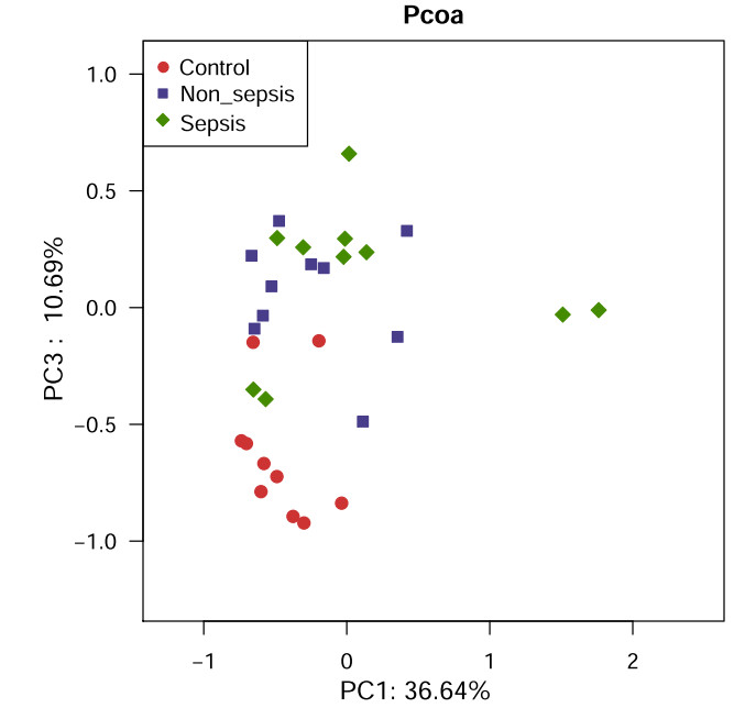 β多样性分析是对不同组间(或不同样本)样本的微生物群落构成进行比较分析,最终通过图示上的距离系数来显示不同组间(或不同样本)之间结构差异性。本研究主坐标分析(Principal Co-ordinates Analysis,PCoA,图 1)显示健康对照组肠道菌群组成结构相似度高,与健康对照组相比,非脓毒症组、脓毒症组肠道菌群结构发生了变化且个体间结构差异性更大。