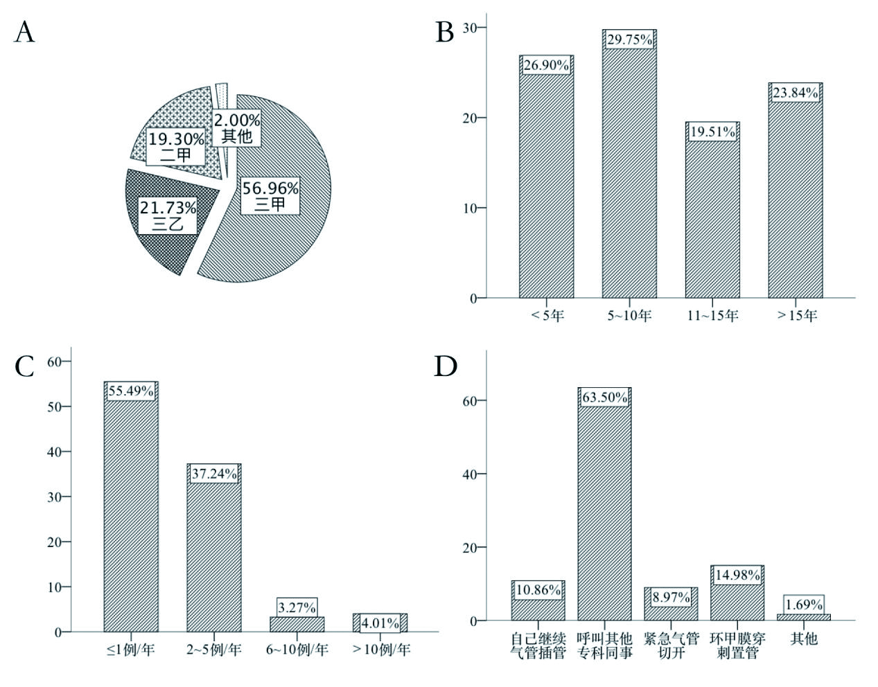| A:工作单位构成;B:工作年限构成;C:碰到紧急困难气道的频次构成;D:针对紧急困难气道首先采取措施构成 图 1 948位调查对象的单位、工作年限、紧急气道接触频次与处置情况 |