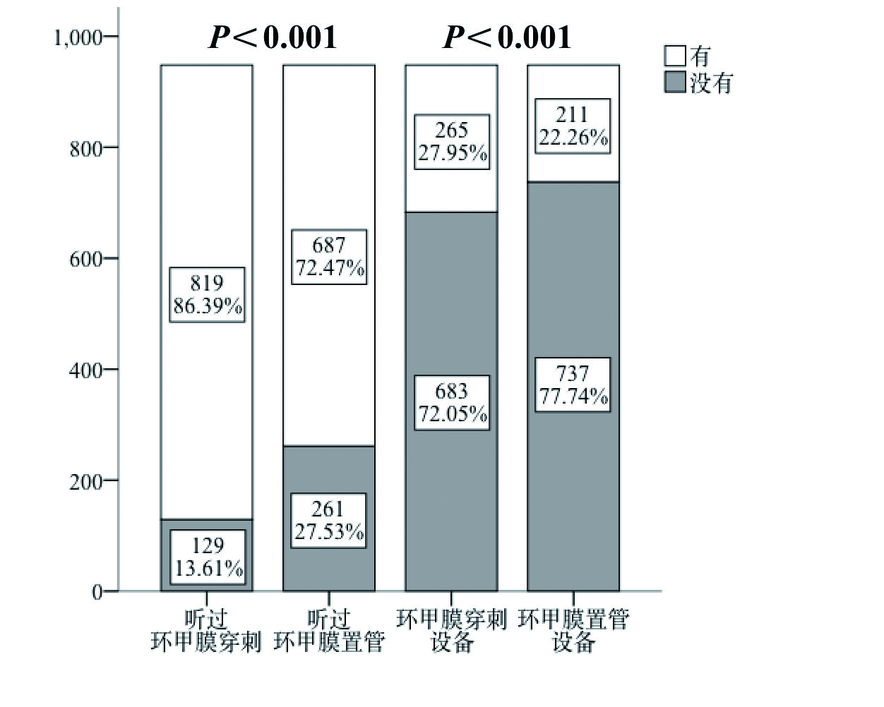| 图 2 948位调查对象对环甲膜穿刺/置管知晓比例与科室配备比例 |