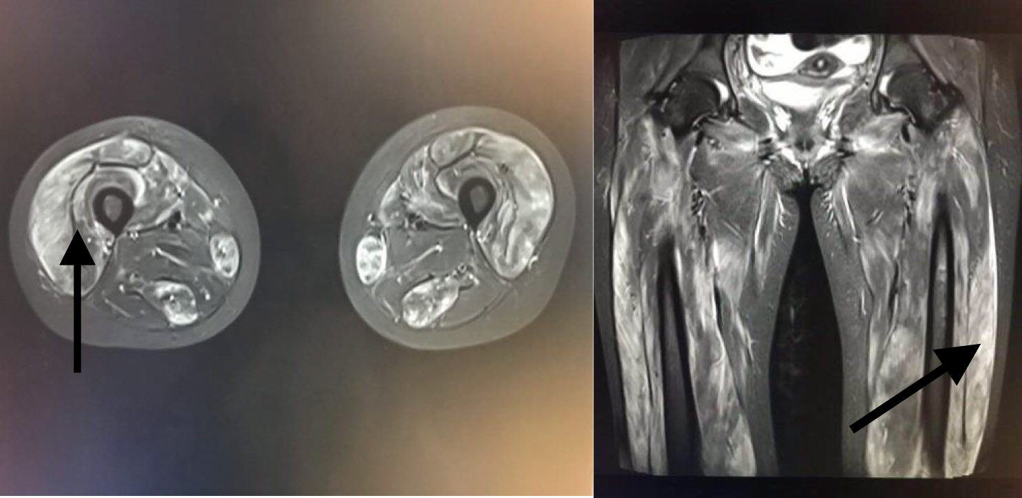 | 图 1 下肢MRI(箭头所指为肌肉水肿表现) |
