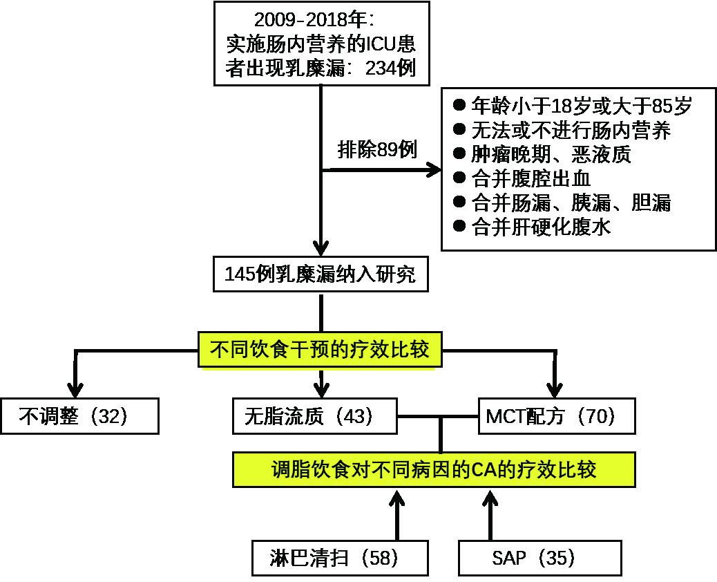 回顾性连续纳入浙江大学医学院附属第一医院外科监护室2009年1月至2018年12月间234例并发CA的外科重症患者。其中89例因以下原因被排除:年龄小于18岁或85岁以上; 无法进行肠内营养; 肿瘤晚期或恶液质; 合并腹腔出血; 合并肠漏、胰漏、胆漏; 以及合并肝硬化腹水等。最终145例已经接受非低脂饮食且较少受其他因素干扰的CA患者纳入本研究。