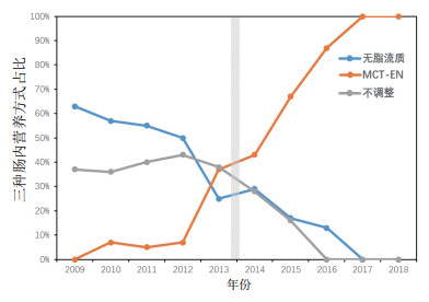 除了保持引流通畅、监测乳糜腹水质和量的变化、防治腹腔感染之外, 目前尚无针对乳糜漏的特殊治疗方法。纳入本研究的145例患者发生乳糜漏后所接受的肠内营养干预共有3种方式:①不作调整(保持原有非低脂饮食); ②无脂流质(米汤); ③MCT营养液(百普力)。本研究将就这3种肠内营养调整方式进行过去10年使用习惯的年代相关性进行分析。