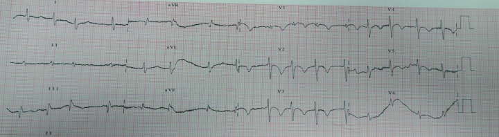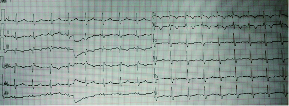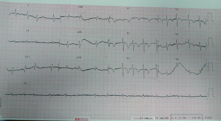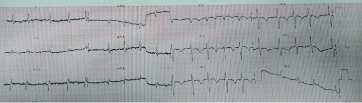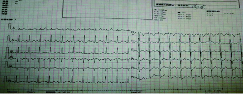 | 图 5 入院时心电图变化,窦性心动过速,SⅠQⅢTⅢ |