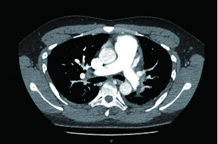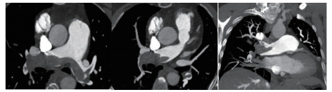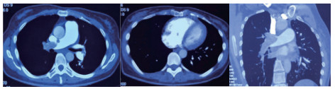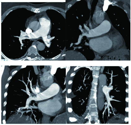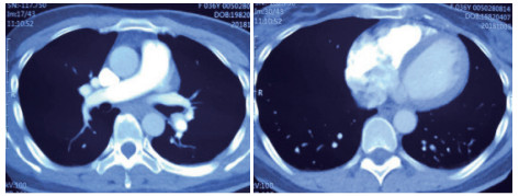 | 图 4 溶栓后的CTPA肺动脉主干血栓负荷明显减少、远段血液灌注明显增加 |
