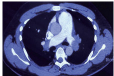 | 图 2 入院时CTPA提示双肺主干明确充盈缺损 |