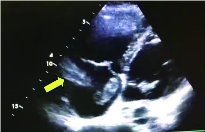 | 图 3 入院1周复查超声心动提示右心房漂浮血栓(黄色箭头) |