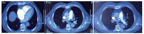 入院查体:神志清楚,体温36.5℃,血压120/70 mmHg,脉率110次/min,呼吸22~26次/min,指氧饱和度93%(安静,空气氧),未见乏氧征。双肺呼吸音清,未闻及干湿性啰音,心率110次/min,律齐,P2 > A2,心界无扩大,无杂音,腹软,无压痛,肠鸣音正常。神经系统未见异常。左下肢膝关节以下可见静脉曲张,双下肢无浮肿。入院诊断:急性肺血栓栓塞症(中高危);左下肢静脉曲张并血栓形成;血小板减少症;肝功能不全。处理方法及原因:患者中年,日常生活质量高;入院20 d前虽有症状,但入院1 d前明显加重并出现晕厥发作;两次D-Dimer检查均<2 000 ng/mL,与CTPA显示的血栓负荷不匹配。入院后连续两次检测血小板均低于正常(51~77 g/L)。因考虑病史较长但近期有加重、血小板低等原因系统溶栓治疗出血风险较大,所以给予导管介入碎栓并行肺动脉内溶栓治疗(r-tPA 20 mg)。溶栓2 h后患者症状明显缓解,复查D-Dimer 12 560 ng/mL,序贯肝素抗凝并复查CTPA提示原有血栓明显消失(图 14所示)。
