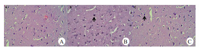 | 大脑额叶皮质中央前回受损神经元变化包括胞浆红染、Nissl体减少和核固缩(箭头所示)。假手术组(A)神经元基本正常,丁苯酞组(C)受损的神经元数显著低于对照组(B) 图 1 大脑额叶皮质中央前回组织病理学变化(HE×200) Fig 1 Histopathological changes in the central anterior gyrus of the cerebral frontal cortex(HE×200) |