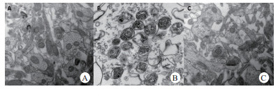 切取约l mm厚右侧大脑皮质的中央前回脑组织立即固定于3%戊二醛溶液。在电镜下每个切片选4个以上不同的区域,采用Fredriksson的方法对线粒体超微结构进行观察并评分[17]。评分标准包括:2分表示正常,1分表示轻度受损,0分表示严重受损。主要评估线粒体基质、嵴、基质密度、结构及连接情况。