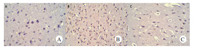| 与假手术组(A)比较,对照组(B)动物神经元凋亡数量显著增加;丁苯酞组(C)神经元凋亡数量较对照组减少 图 3 大脑额叶皮质中央前回TUNEL染色 Fig 3 TUNEL stain of the central anterior gyrus of the cerebral frontal cortex |