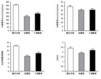与假手术组比较,对照组猪大脑额叶皮质神经细胞线粒体R3和R4耗氧量、R3/R4和ADP/O均显著降低(P<0.01)。经过丁苯酞治疗后,除了R4耗氧量外,R3耗氧量、R3/R4和ADP/O均显著改善(P<0.01,图 4)。