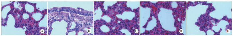 | A:假手术组,B:感染性休克组,C:U50488H+感染性休克组,D:nor-BNI+U50488H+感染性休克组,E:nor-BNI+感染性休克组 图 1 各组光镜下肺组织病理学改变(HE×400) Fig 1 Histopathological features of lung(HE×400) |