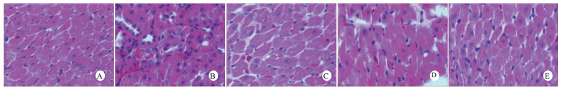 | A:假手术组,B:感染性休克组,C:U50488H+感染性休克组,D:nor-BNI+U50488H+感染性休克组,E:nor-BNI+感染性休克组 图 2 各组光镜下心肌组织病理学改变(HE×400) Fig 2 Histopathological features of myocardium(HE×400) |