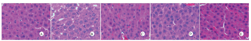 | A:假手术组,B:感染性休克组,C:U50488H+感染性休克组,D:nor-BNI+U50488H+感染性休克组,E:nor-BNI+感染性休克组 图 3 各组光镜下肝组织病理学改变(HE×400) Fig 3 Histopathological features of liver(HE×400) |