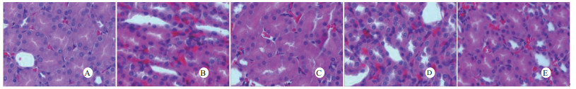 | A:假手术组,B:感染性休克组,C:U50488H+感染性休克组,D:nor-BNI+U50488H+感染性休克组,E:nor-BNI+感染性休克组 图 4 U50488H对感染性休克肾组织形态的影响(HE×400) Fig 4 Histopathological features of kidney(HE×400) |