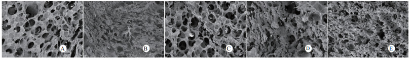 | A:假手术组,B:感染性休克组,C:U50488H+感染性休克组,D:nor-BNI+U50488H+感染性休克组,E:nor-BNI+感染性休克组 图 5 肺组织扫描电镜观察(×200) Fig 5 Scanning electronic microscopic photos of lung(×200) |