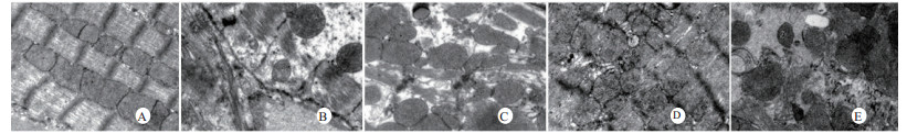 | A:假手术组,B:感染性休克组,C:U50488H+感染性休克组,D:nor-BNI+U50488H+感染性休克组,E:nor-BNI+感染性休克组 图 6 心肌细胞透射电镜检查(×10 000) Fig 6 Transmission electronic microscopic photos of myocardial cell(×10 000) |