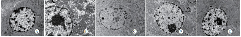 | A:假手术组,B:感染性休克组,C:U50488H+感染性休克组,D:nor-BNI+U50488H+感染性休克组,E:nor-BNI+感染性休克组 图 7 肝细胞透射电镜检查(×10 000) Fig 7 Transmission electronic microscopic photos of liver(×10 000) |