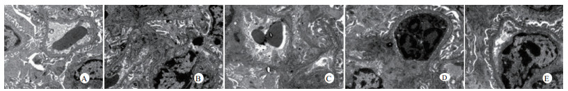 | A:假手术组,B:感染性休克组,C:U50488H+感染性休克组,D:nor-BNI+U50488H+感染性休克组,E:nor-BNI+感染性休克组 图 8 肾组织透射电镜检查(×15 000) Fig 8 Transmission electronic microscopic photos of kidney(×15 000) |