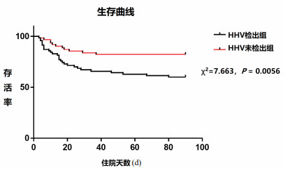 | 图 1 HHV检出组和未检出组脓毒症患者的生存曲线 Fig 1 The survival curve of HHV-detected and HHV-undetected groups |