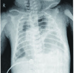 | 图 1 左侧先天性膈疝伴右侧气胸,高频通气中 |