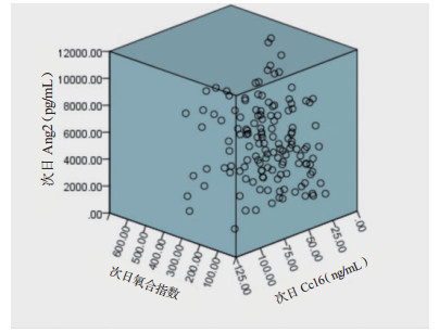 | 图 1 ARDS患者首日Ang-2、CC16和氧合指数间两两的关系(n=100) Fig 1 The correlation between Ang-2, CC16 and oxygenation index in the first day in ARDS patients (n=100) |
