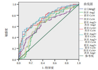 2.5 血清Ang-2和CC16水平对ARDS的诊断阈值采用受试者工作特征(ROC)曲线对各指标进行分析,首日及次日血清Ang-2和CC16水平对ARDS有诊断意义。如表 3和图 3所示,首日及次日血清Ang-2水平参考指标的曲线下面积具有统计学意义,相应对重症患者发生ARDS的诊断阈值分别为首日血清Ang-2 > 4 275.01 pg/mL,敏感度为65.8%,特异度为66.0%;次日血清Ang-2 > 3 935.12 pg/mL,敏感度为67.1%,特异度为64.9%。CC16水平参考指标的曲线下面积具有统计学意义,其相应对重症患者发生ARDS的诊断阈值分别为首日血清CC16 > 33.67 ng/mL,敏感度为69.6%,特异度为70.2%;次日血清CC16 > 27.59 ng/mL,敏感度为67.1%,特异度为62.8%。两项组合检测对早期诊断ARDS的敏感性有所增加;其中敏感性最高为首日Ang-2组合首日CC16(敏感度为75.9%),特异性最高为首日血清CC16水平(特异度为70.2%)。