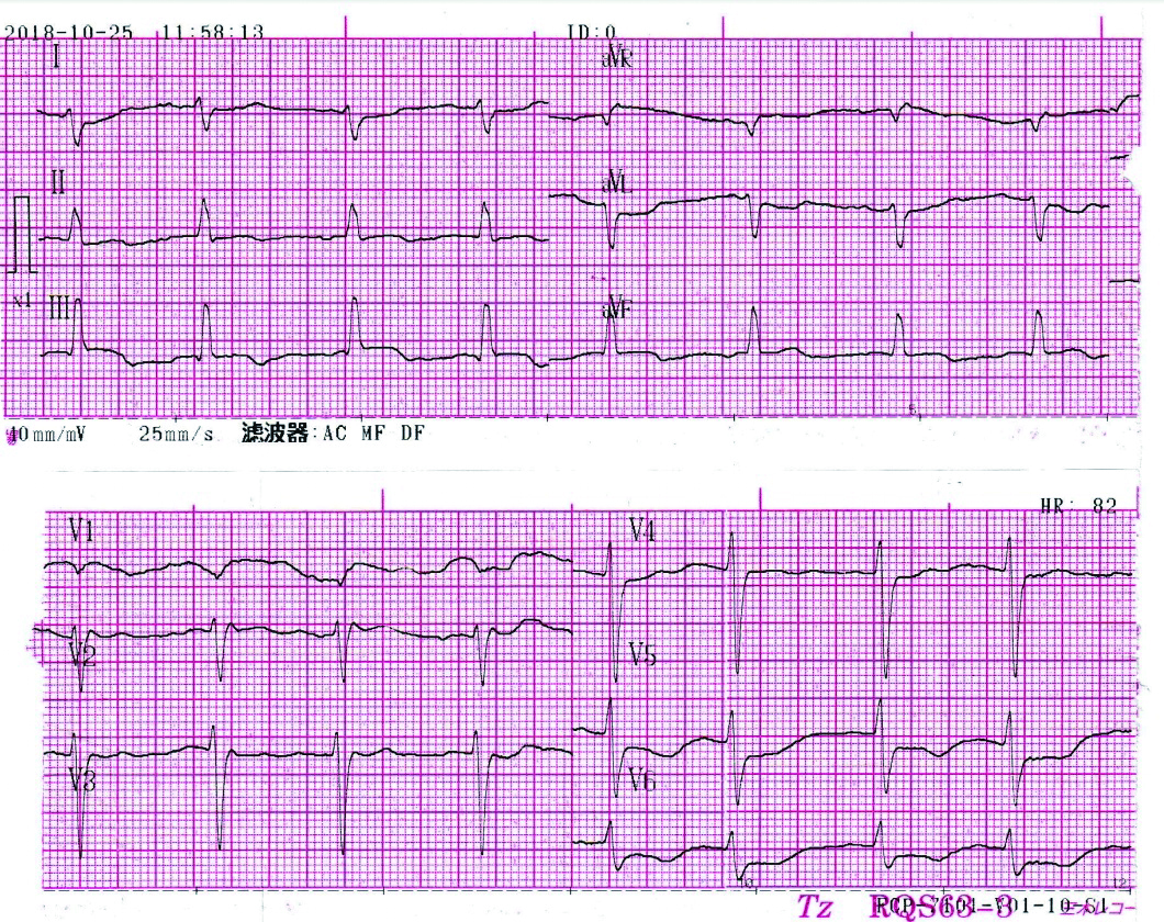 | 图 1 患者入院心电图肢体导联及胸导联(均有T波低平或倒置,V4-V6导联ST段压低) |