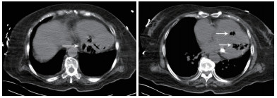| 示左心室、室间隔见不规则条状、条片状低密度影,参考CT值约-200~-900 HU,提示为气体影,左心室为著,外周分布为主,似累及心肌区域,部分心肌变薄,心包区域尚连续(白色箭头所示) 图 2 患者胸部CT结果 |