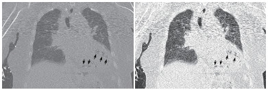 | 示气体影以左心室为著,外周分布为主,似累及心肌区域,部分心肌变薄(黑色箭头所示) 图 3 患者胸部CT冠状位影像 |